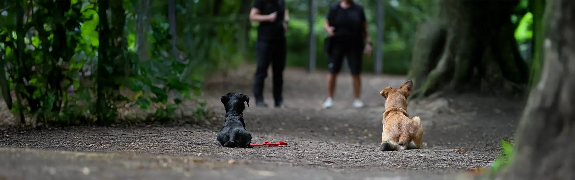 Zwei Hunde liegen auf einem Waldboden in einem grünen Park. Ein schwarzer Hund liegt links und ein heller Hund sitzt rechts. Im Hintergrund stehen zwei Personen, die auf die Hunde aufpassen.